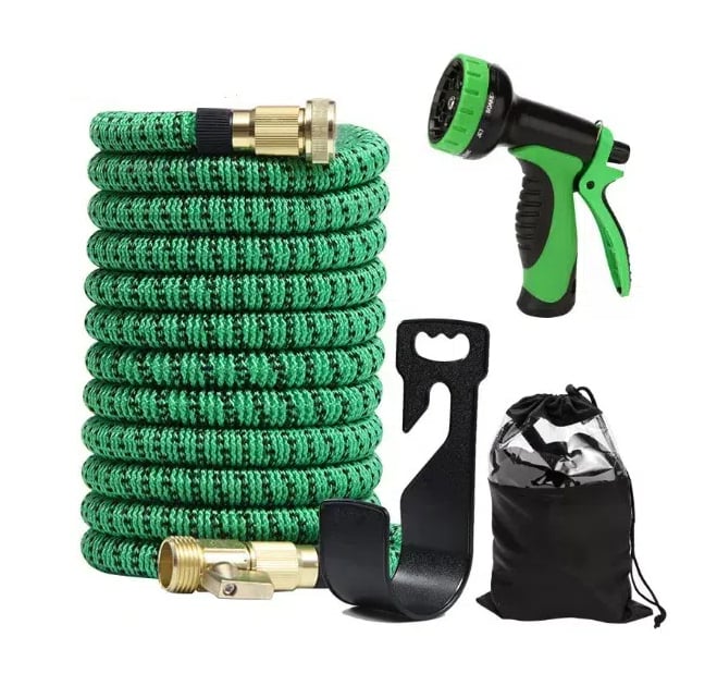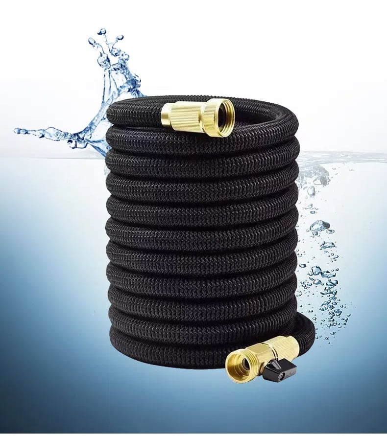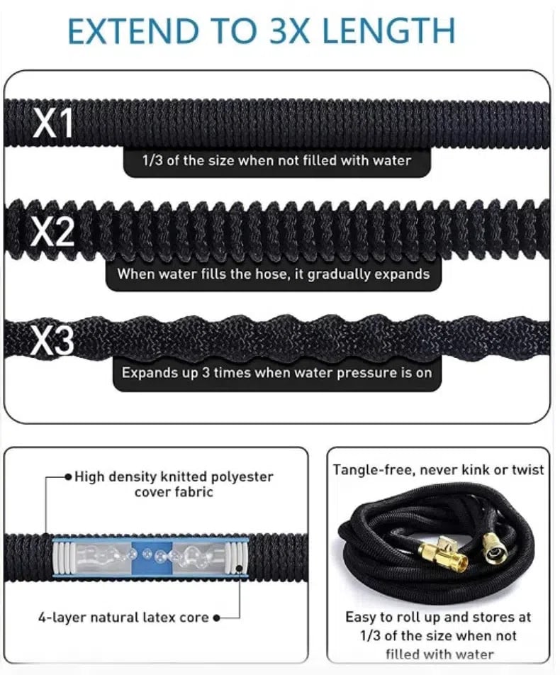 The hose expands 3 times its original length when the water pressure is turned on, growing from 17 feet to 50 feet. When the water is turned off, it shrinks back to its original size, making storage quick and easy. This hose is incredibly convenient for covering large areas like your entire garden.